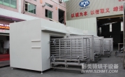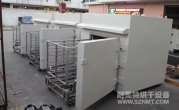 (8)烘干箱內(nèi)可存放1輛推車(chē)。推車(chē)配置耐高溫角輪(定向輪、萬(wàn)向輪各2個(gè)),推車(chē)?yán)锩姘惭b限位柱用于定位里面托盤(pán),兩側(cè)配有L形托架,用于支撐及左右限位托盤(pán)。進(jìn)出口裝有手動(dòng)爐門(mén)。頂部部置循環(huán)風(fēng)機(jī)、蒸氣換熱器等裝置,排廢風(fēng)機(jī)安裝在爐體頂部。